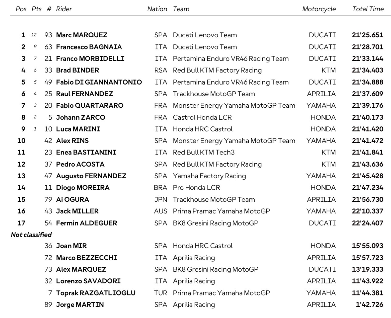 Hasil Sprint Race MotoGP Spanyol 2026 (25/4):