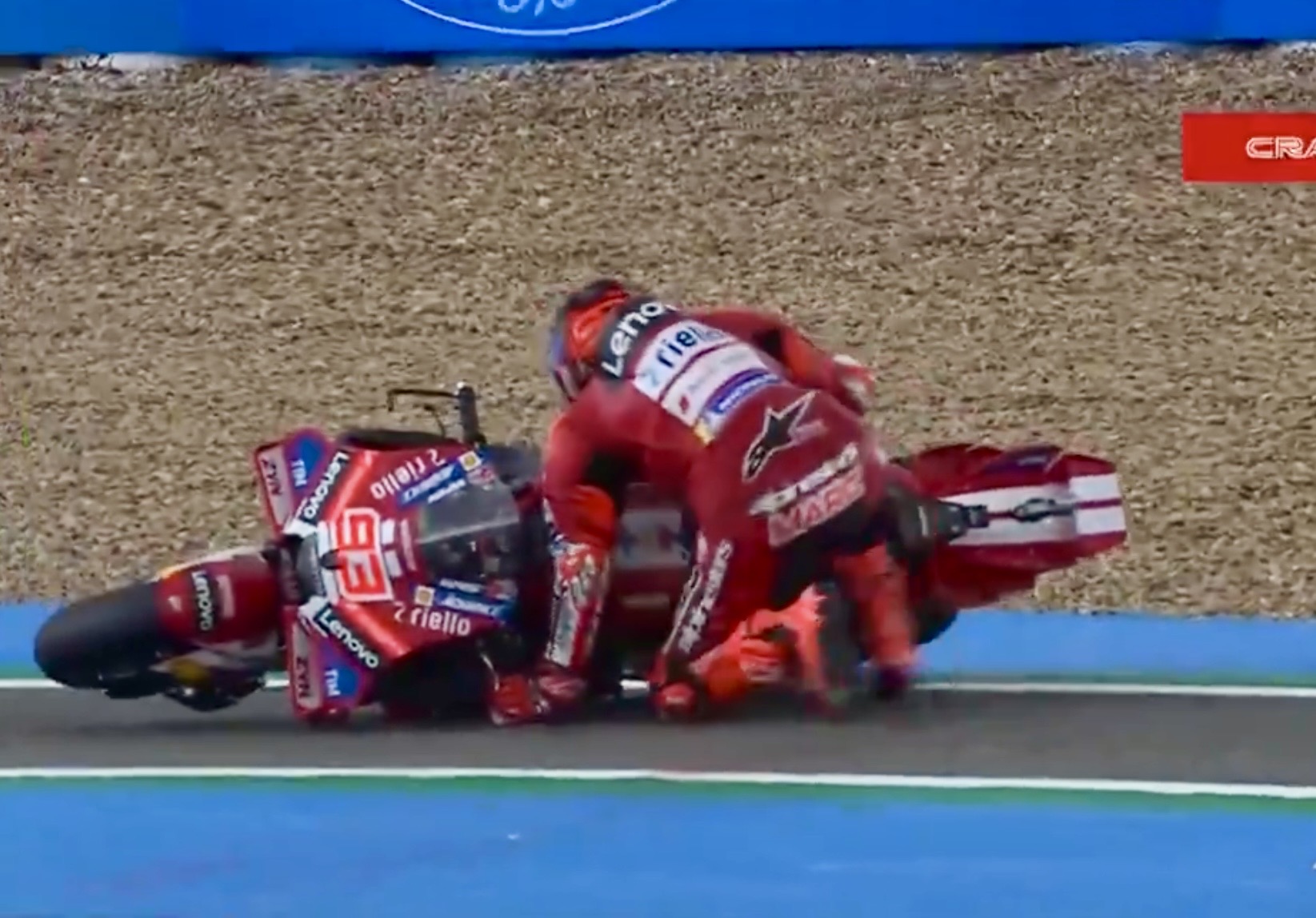 Hujan mulai turun dari rintik menjadi deras, Marc pun terjatuh di Tikungan terakhir akibat kehilangan grip ban depan. Namun, karena hal itu dirinya memanfaatkan terjatuh untuk kembali ke pit dan mengganti motor dengan ban basah di empat lap tersisa.