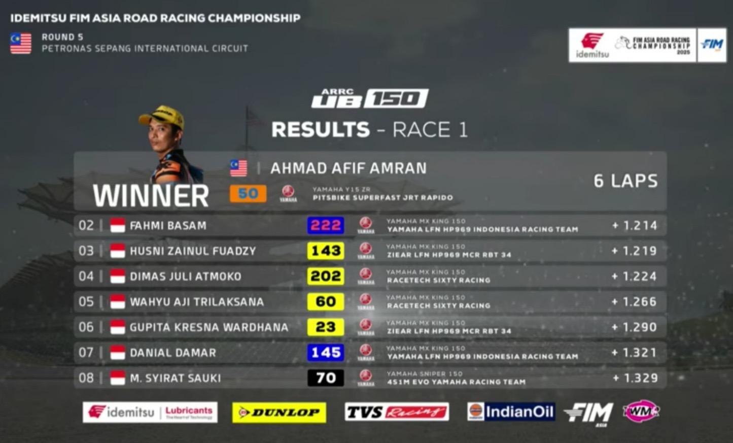 Hasil Race 1 UB150 ARRC Malaysia 2025 :