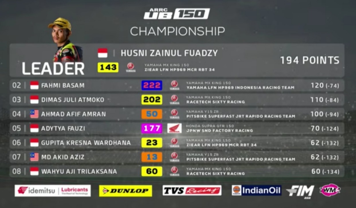 Meski begitu, meski podium ketiga, namun Alfi Husni nyaris mengunci Juara Asia UB150 2025. Pasalnya dengan finish di belakang Fahmi Basam, dirinya masih berselisih 74 poin dengan tiga race tersisa.
