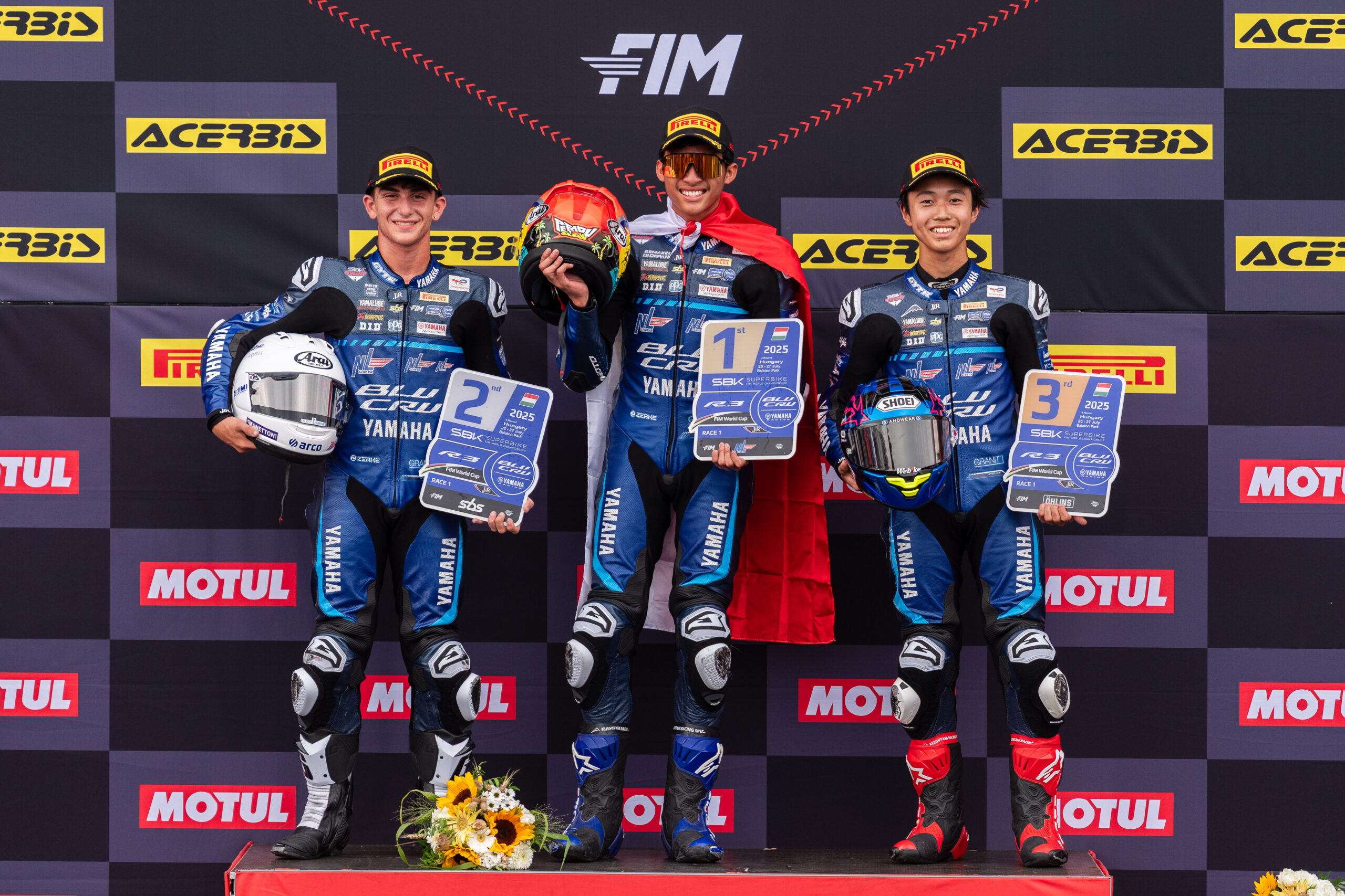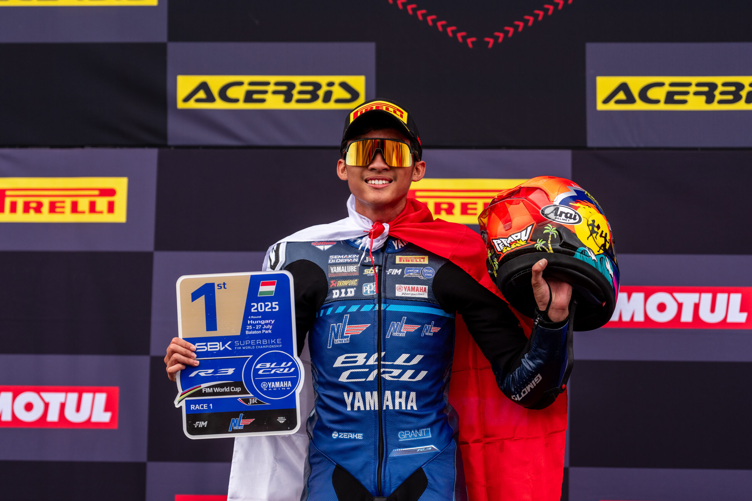 Arai Agaska berhasil menjadi juara di Race 1 FIM R3 BLU CRU World Cup 2025 seri Hungaria di sirkuit Balaton Park, (26/7).