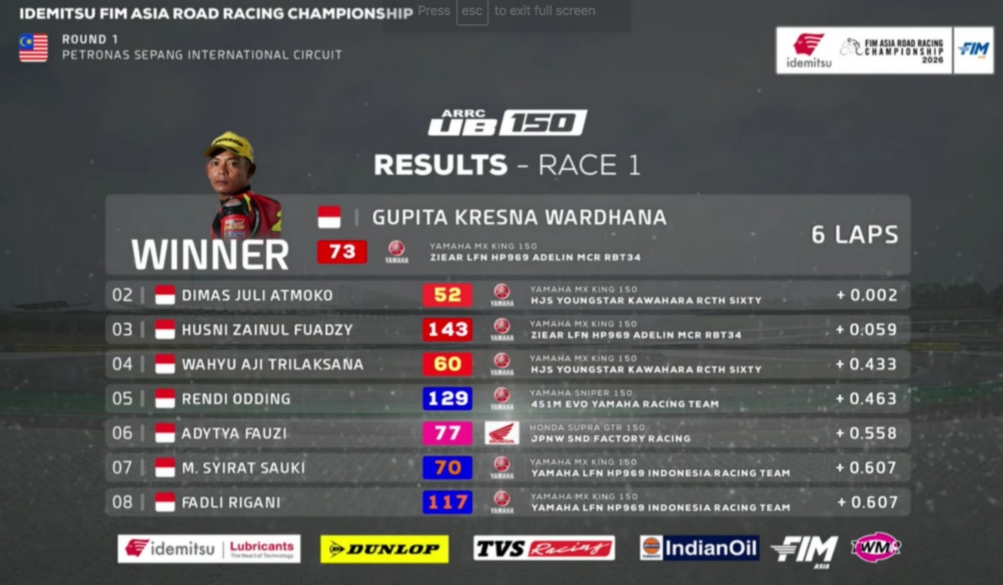 Hasil Race 1 UB150 ARRC Malaysia 2026 (11/4) :