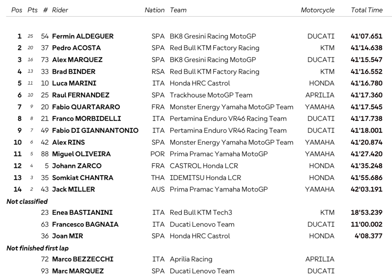 Jarak Aldeguer dan Acosta sendiri sudah sentuk lebih dari 8 detik ketika memasuki lap terakhir. Dengan begitu, Fermin Aldeguer pun berhasil meraih juara pertamanya di kelas MotoGP.