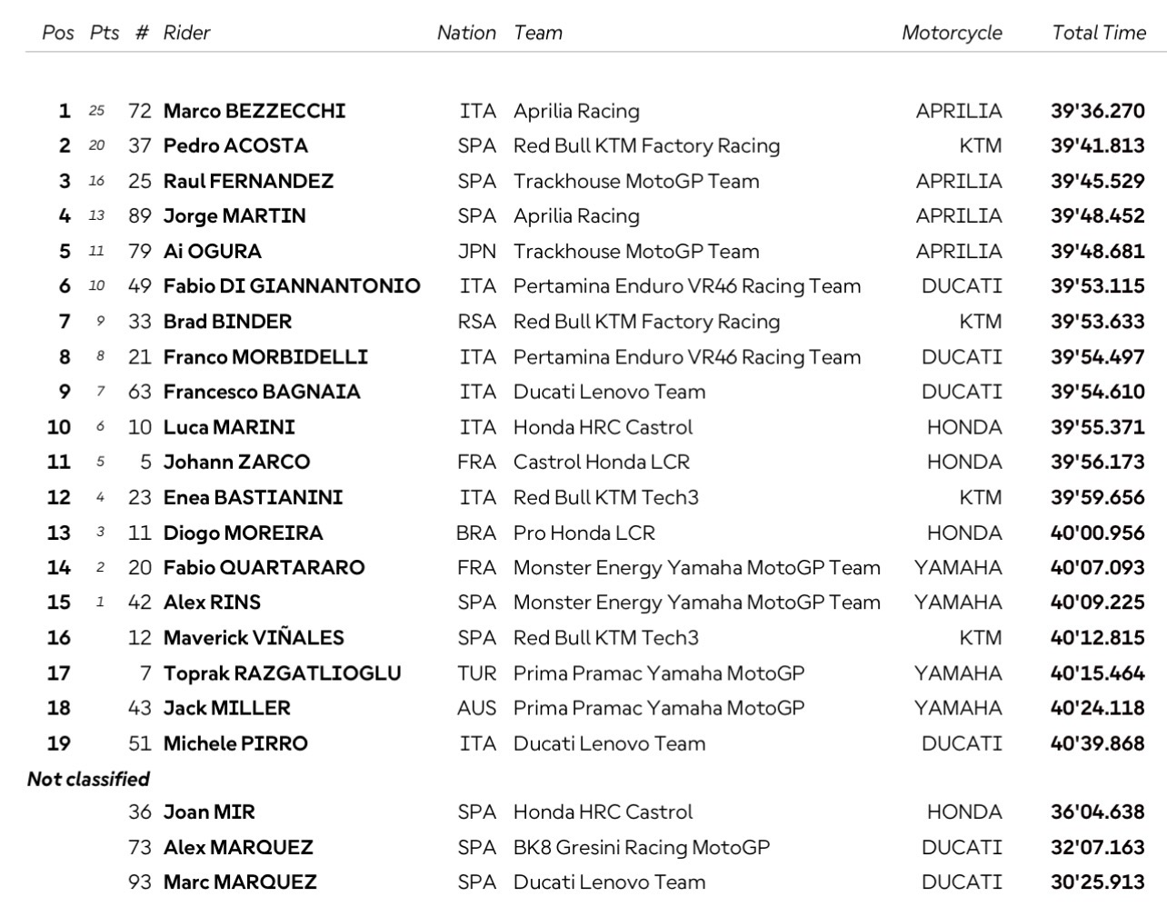 Tidak cukup sampai di situ, setidaknya dua pembalap Aprilia lainnya juga berhasil finish di posisi lima besar. Jorge Martin yang merupakan rekan setim Bezzecchi finish di posisi 4 dan diikuti rekan setim Raul, Ai Ogura yang finish di posisi 5.