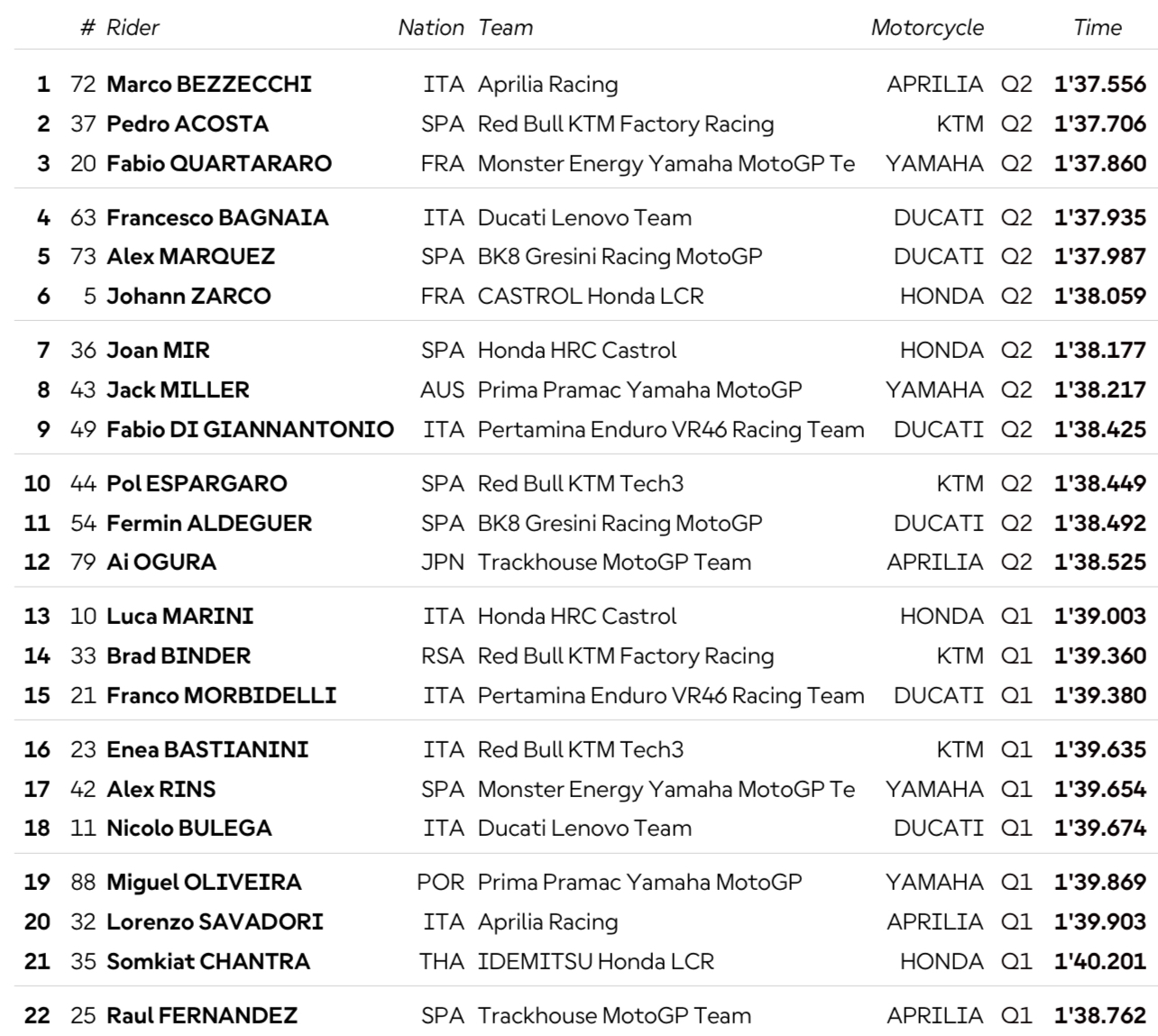 Justru Pedro Acosta (Red Bull KTM Factory Racing) yang berhasil meraih posisi kedua dan menyingkirkan Quartararo ke posisi tiga usai mencetak 01;37,706 detik.