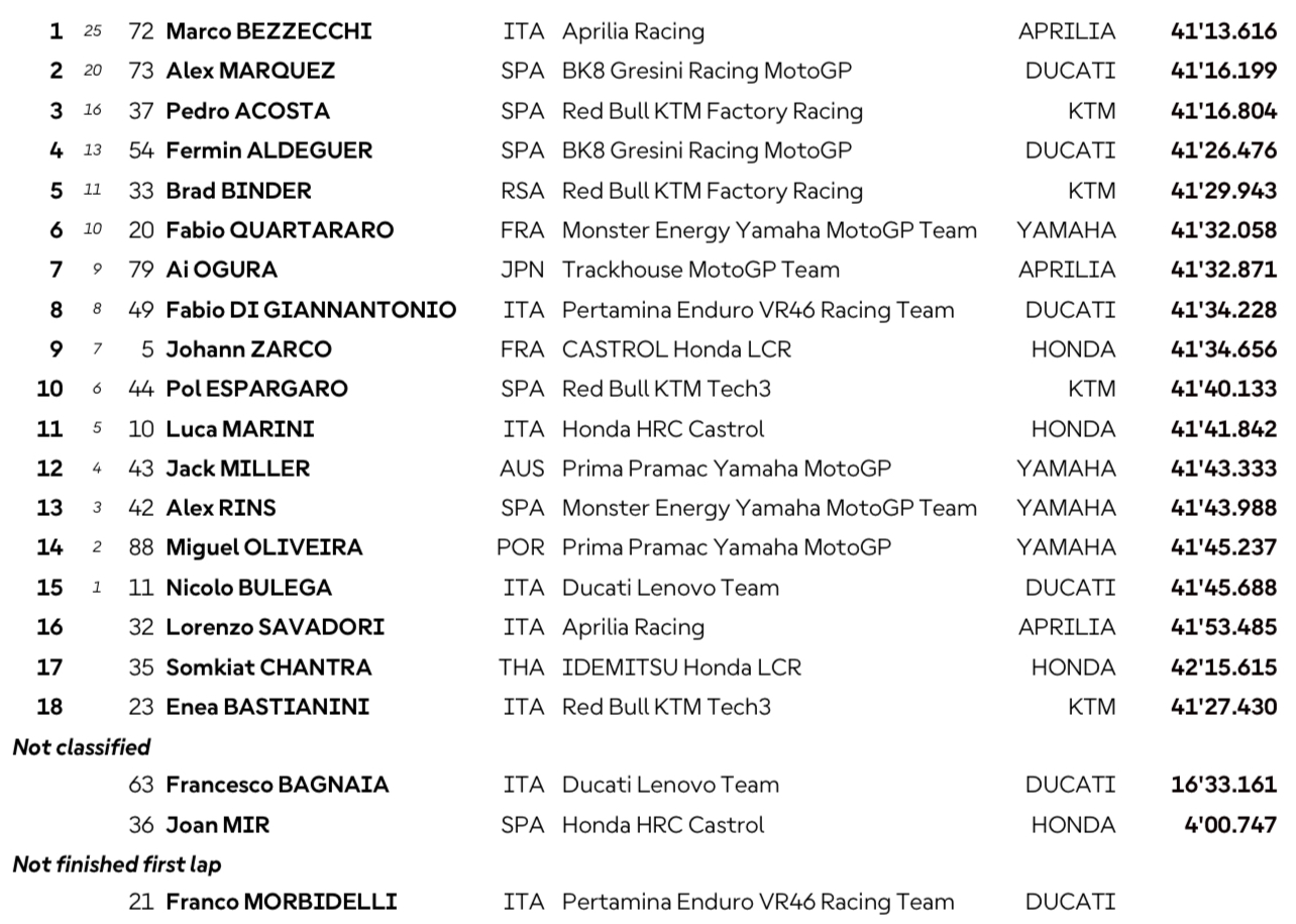 Lampu start padam, Bezzecchi mampu menempati posisi pertama diikuti Acosta dan Alex Marquez (Gresini Racing) di posisi tiga. Sedangkan Quartararo mundur ke posisi empat diikuti Pecco Bagnaia (Ducati Lenovo).