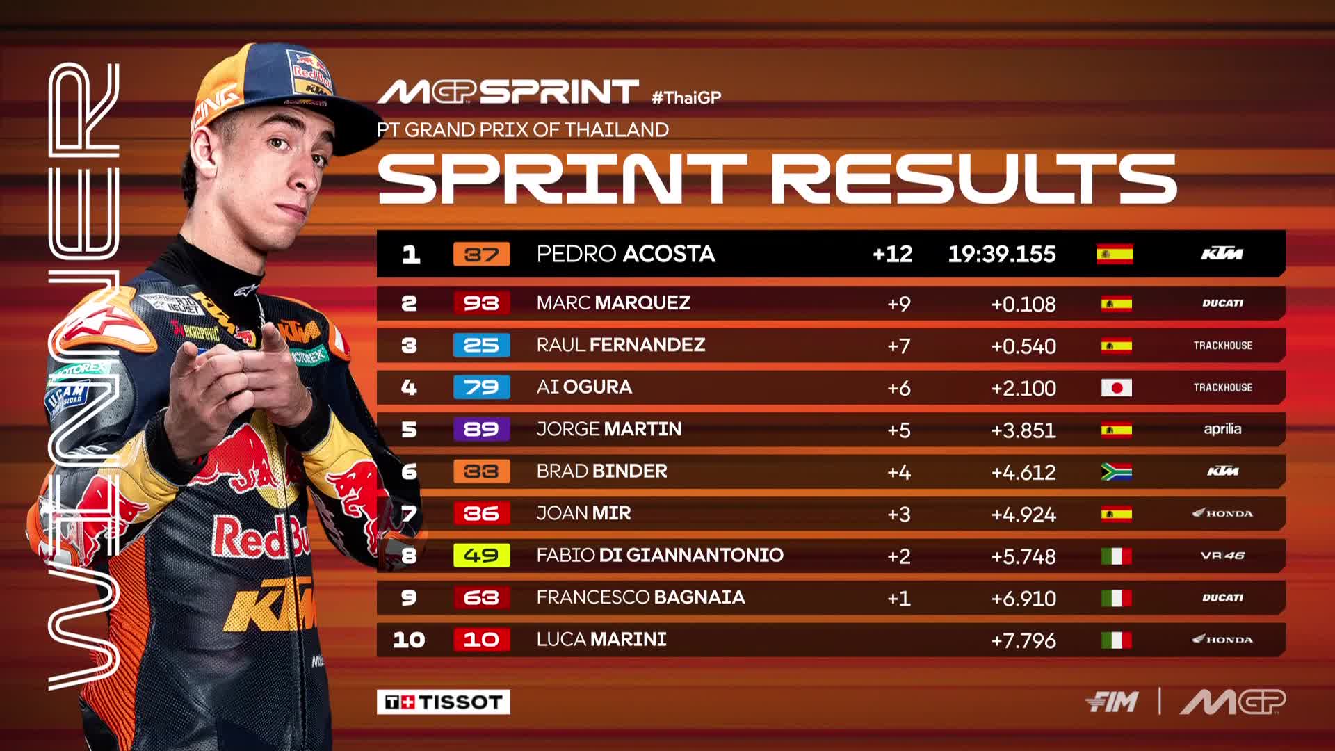 Kondisi ini membuat Pedro Acosta berhasil finish terdepan dan meraih juara pertamanya dan sekaligus pertama kalinya menang Sprint Race selama karirnya di MotoGP.
