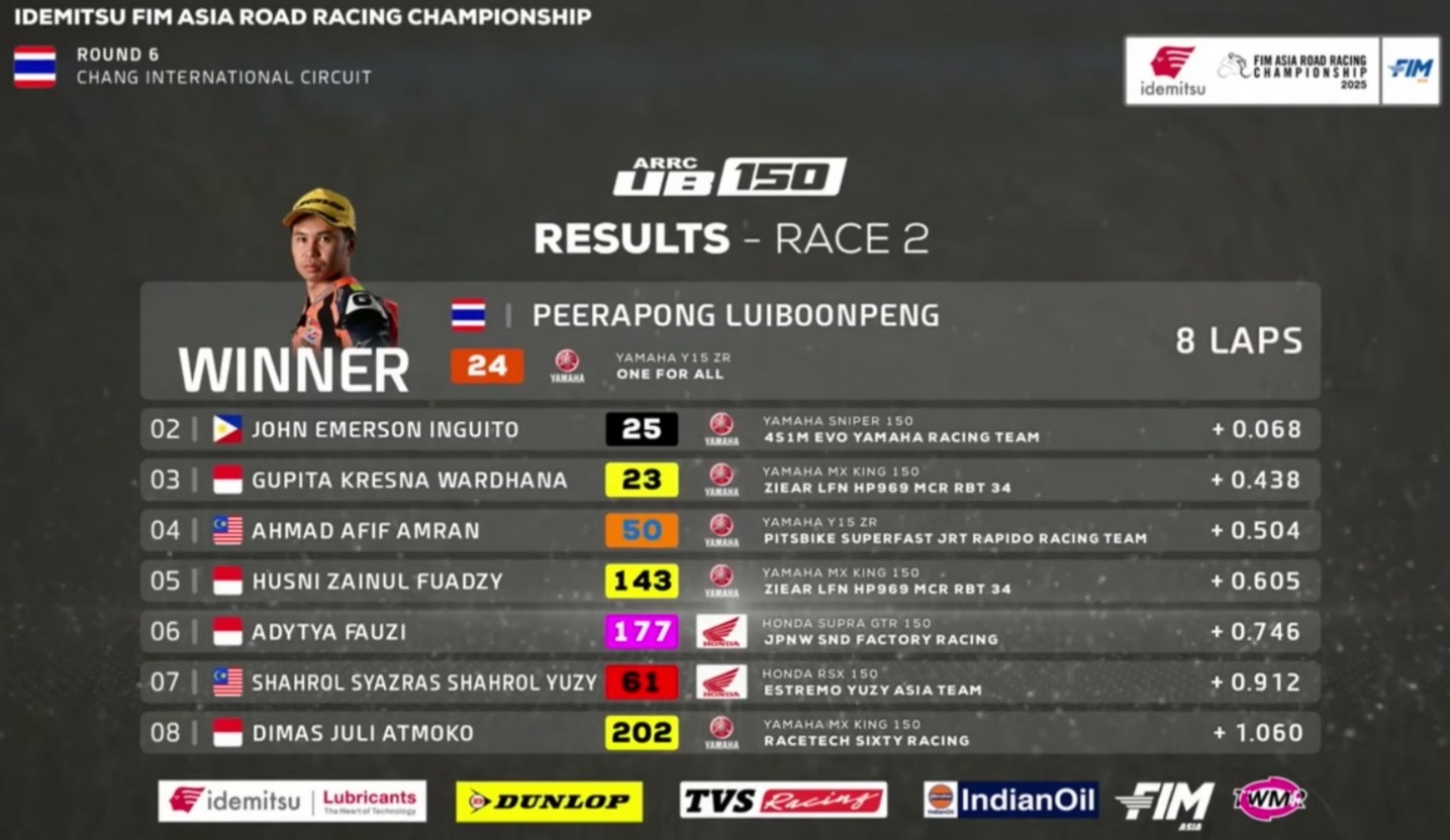 Peerapong Luiboonpeng berhasil memimpin para pembalap untuk finish terdepan diikuti John Emerson Inguito asal Filipina dari tim 4S1M EVO Yamaha RacingTeam.