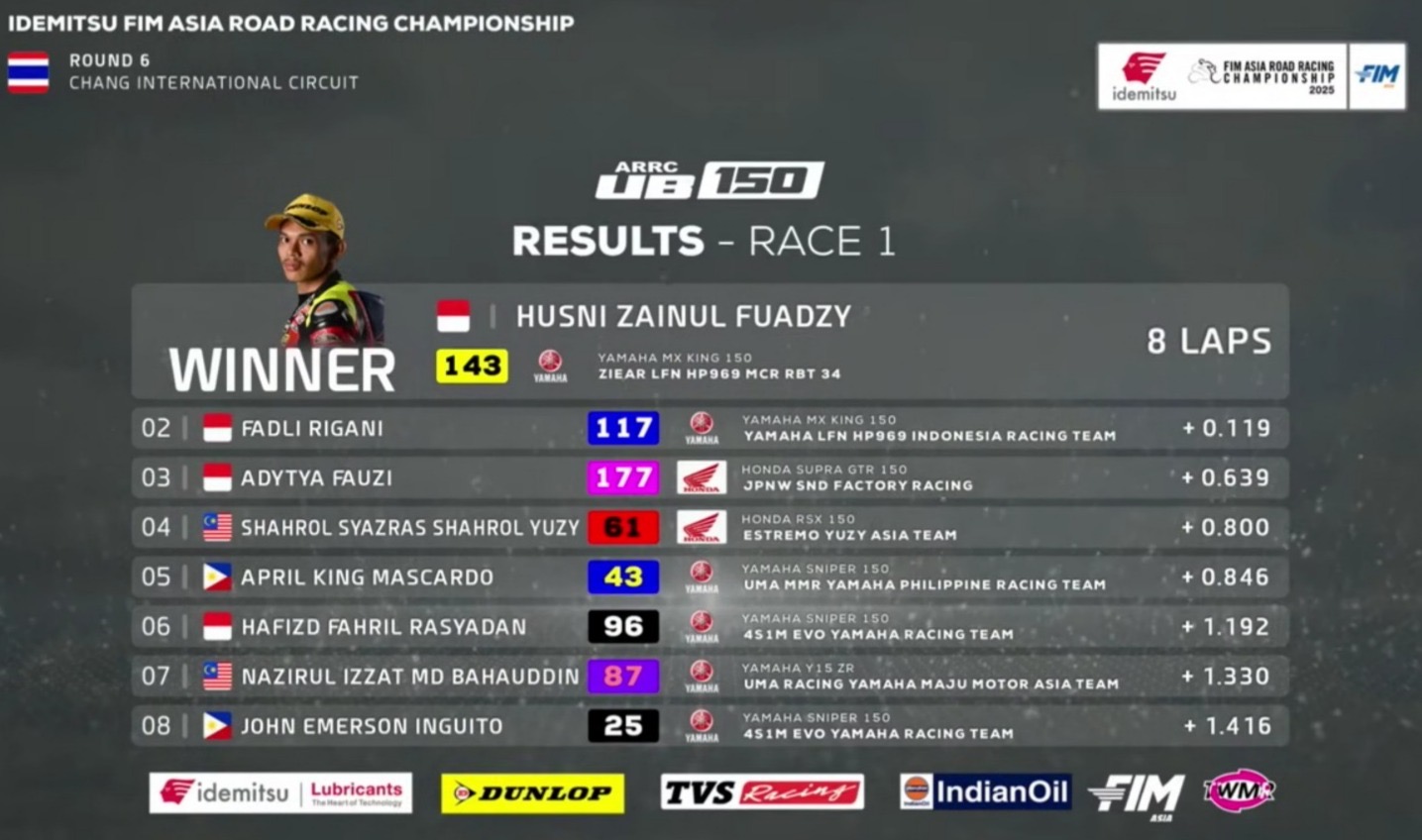 Alfi Husni alias Husni Zainul Fuadzy (ZIEAR LFN HP969 MCRRBT 34), Fadli Rigani (Yamaha LFN HP969 Indonesia Racing Team) dan Aditya Fauzi (JPNW SND Factory Racing) menjadi tiga pembalap Indonesia yang podium di Race 1 UB150 ARRC Thailand 2025 (6/12).