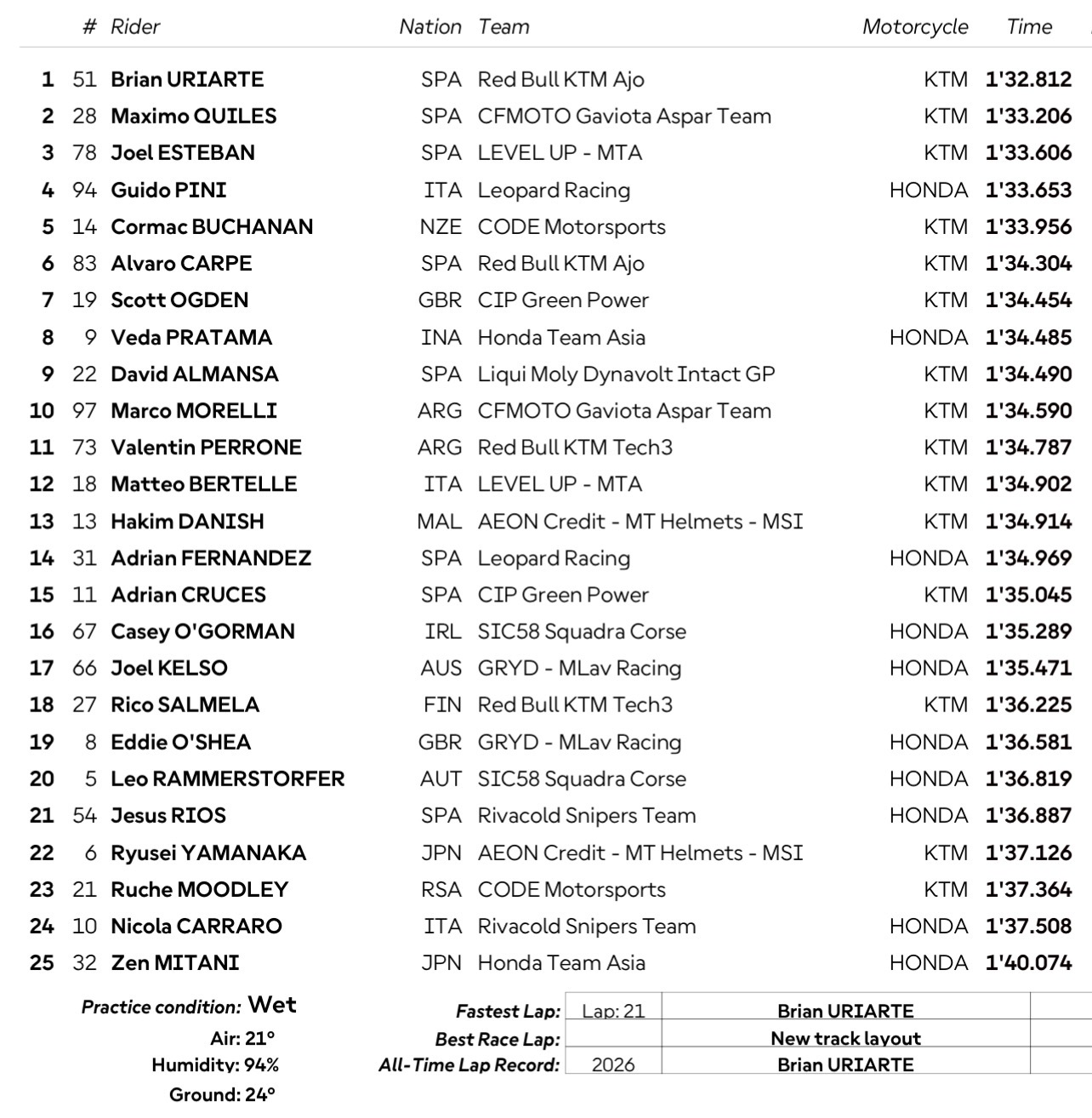 Bestlap yang dicetak Veda Ega Pratama adalah 01;34.485 detik. Dirinya hanya tertinggal 1,673 detik dari Brian Uriarte (Red Bull KTM Ajo) yang juga menjadi lawan sengitnya di ajang Red Bull Rookies Cup tahun lalu.