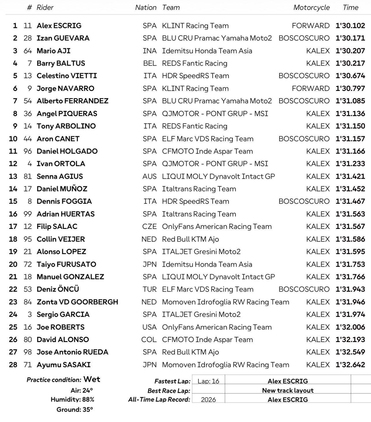 Dengan bestlap 01;30,207 pembalap Honda Team Asia ini hanya tertinggal 0,105 detik dari Alex Escrig dari KLINT Racing Team.
