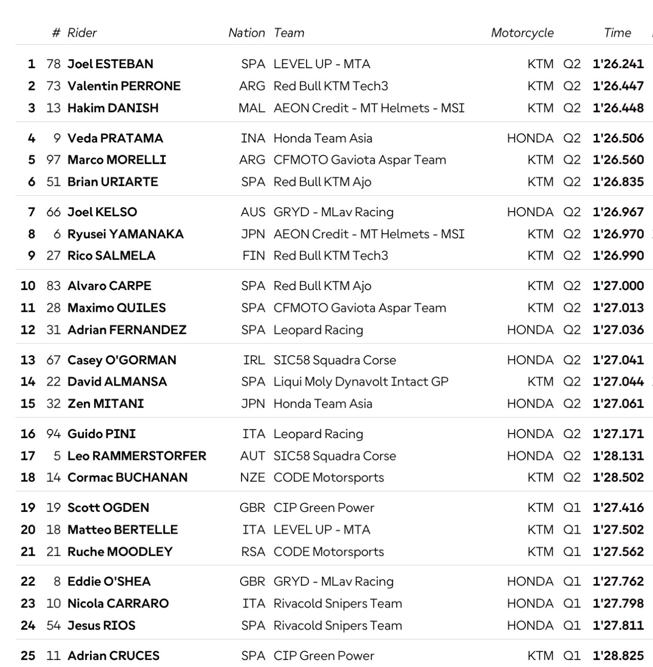 Veda Ega Pratama hanya terpaut 0,265 detik dari Joel Esteban dari tim Level Up – MTA yang mencetak bestlap 01;26,241 detik di depannya.