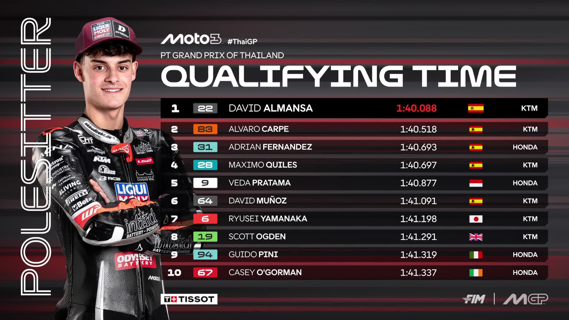 Namun begitu, David Almansa (Liqui Moly Dynavolt Intact GP) berhasil meraih pole position dengan mencetak bestlap 01;40,008 detik.